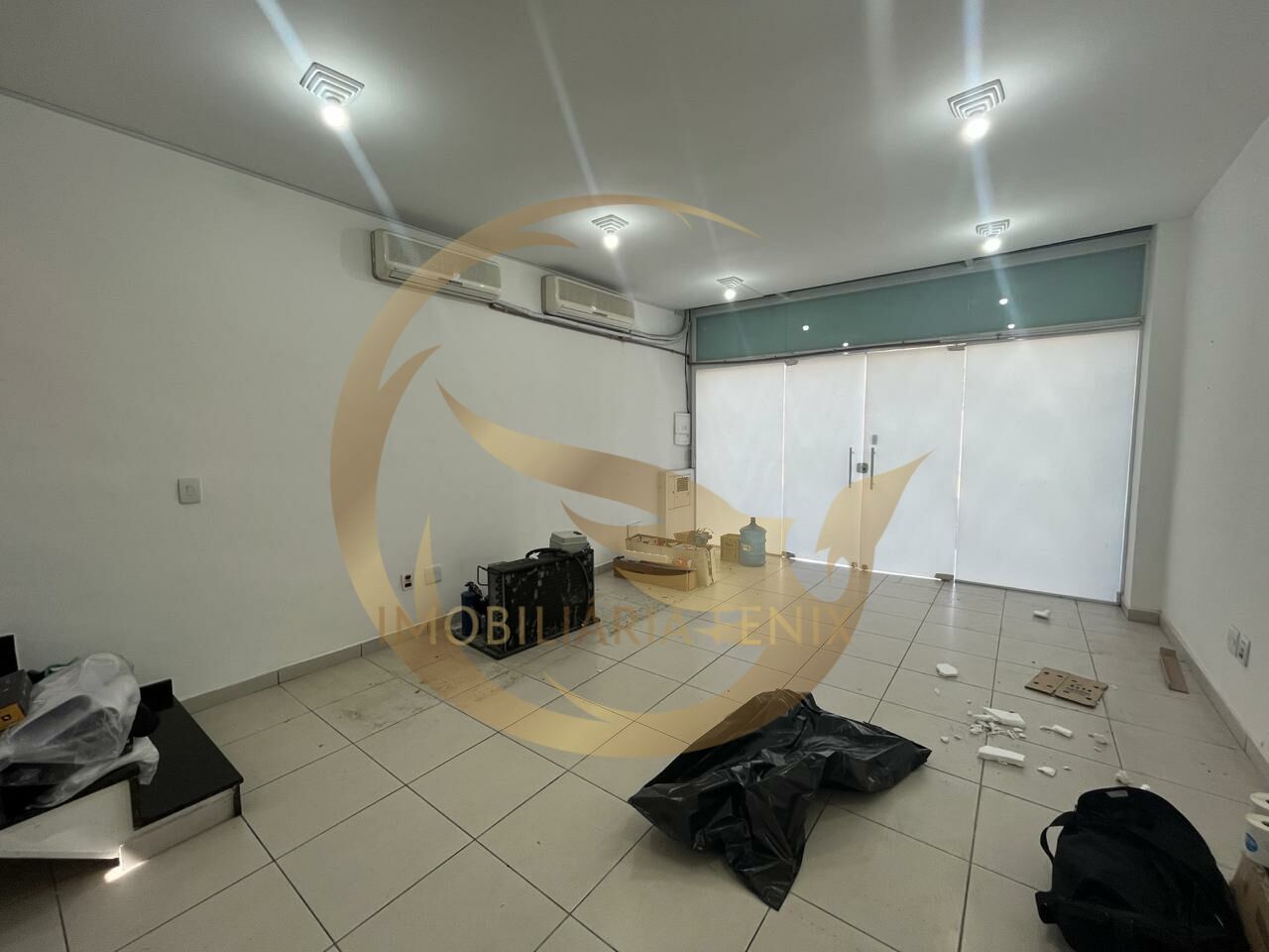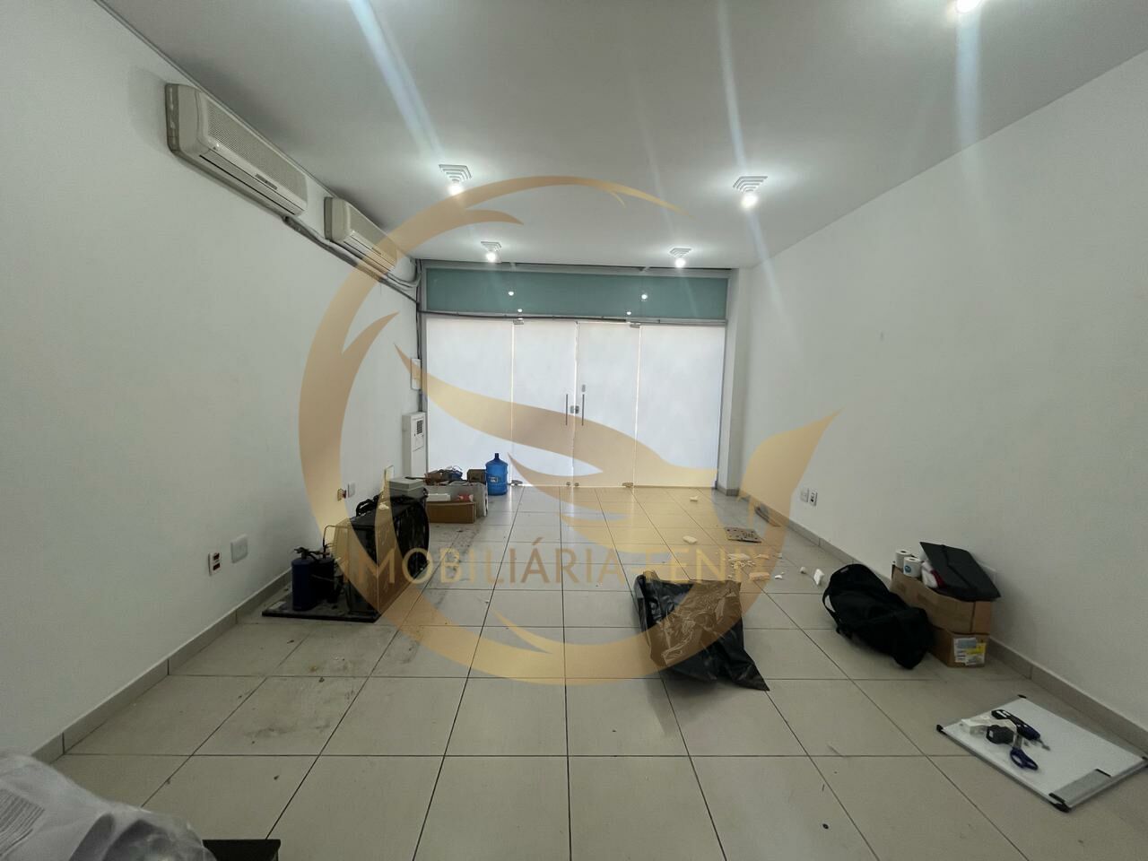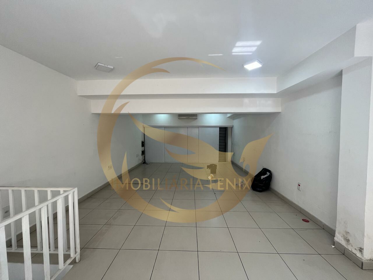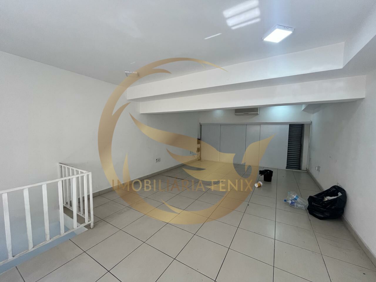 Aproximadamente 40 m² de área de salão, piso frio e pé direito de 3 metros. Mezanino, banheiro e área externa. Porta automática.