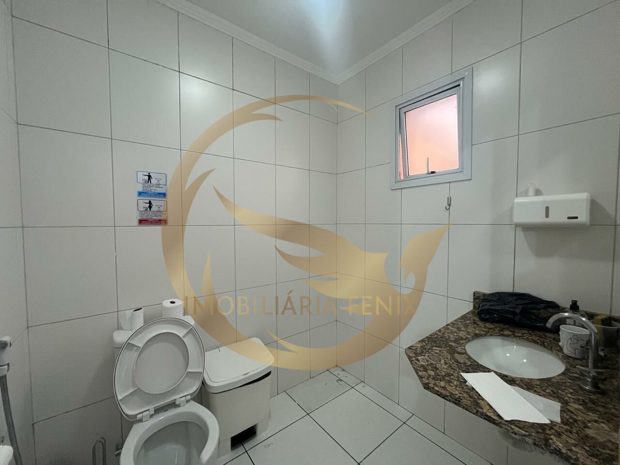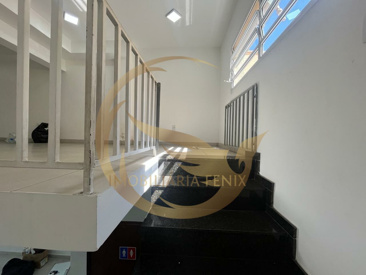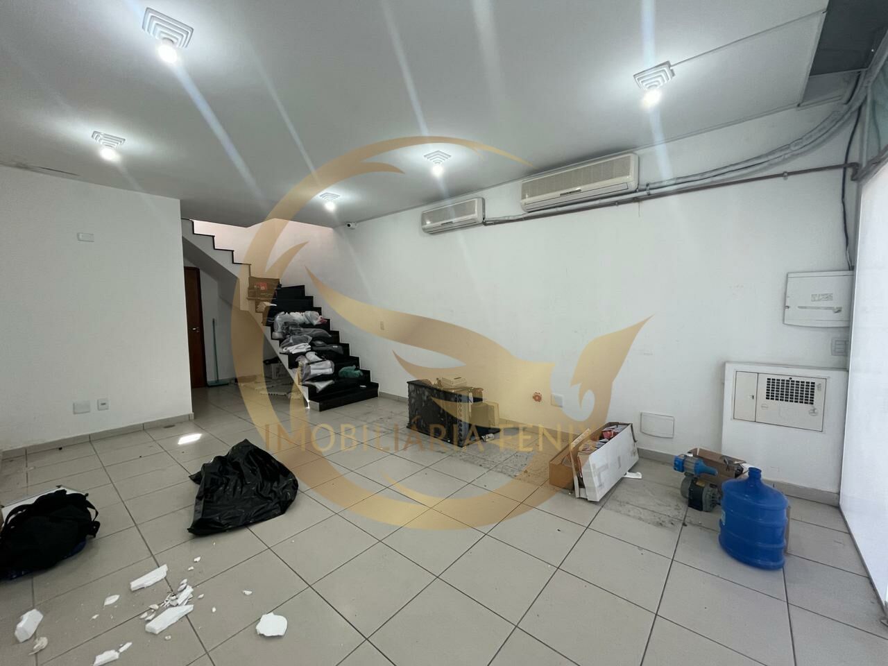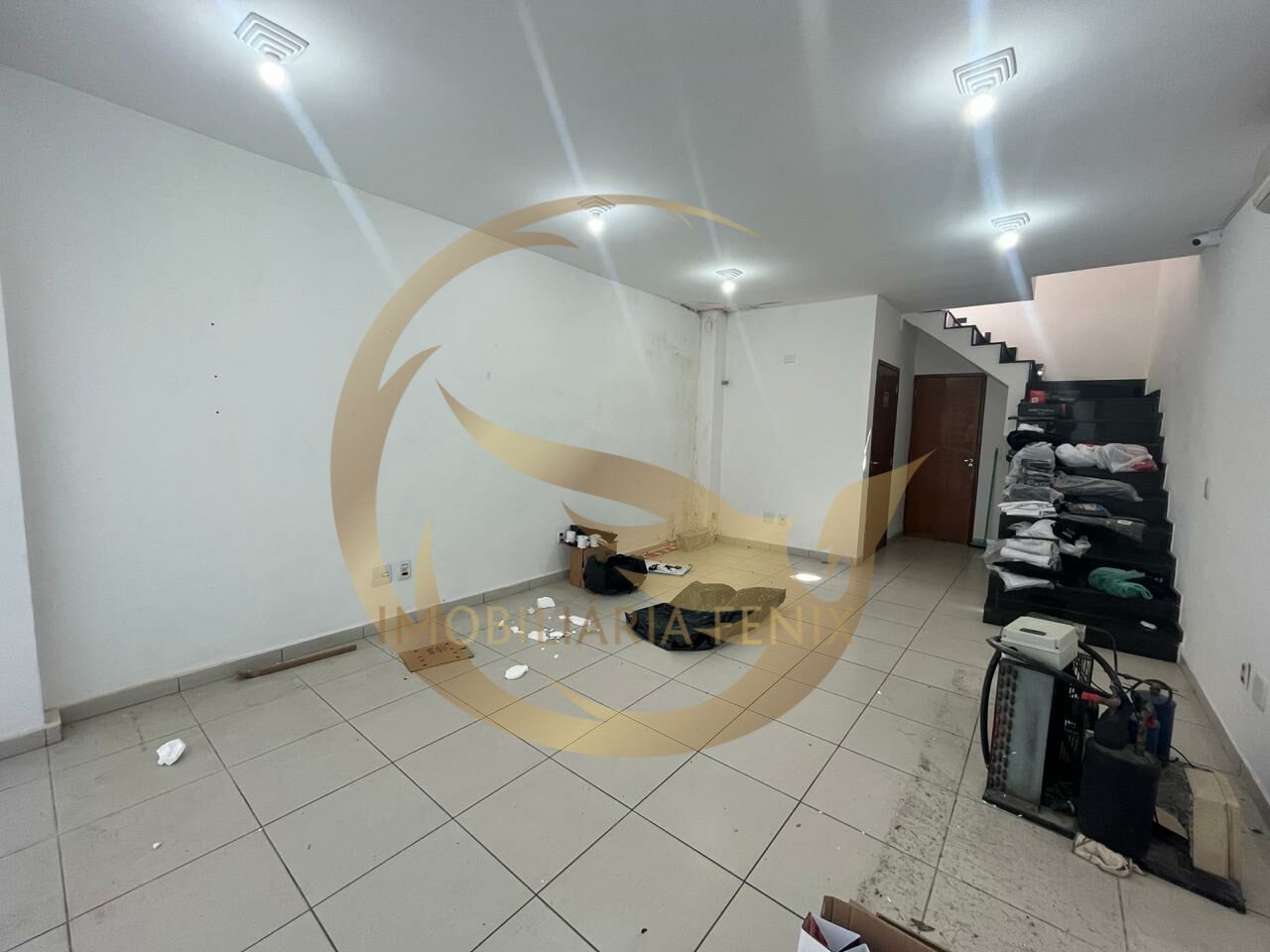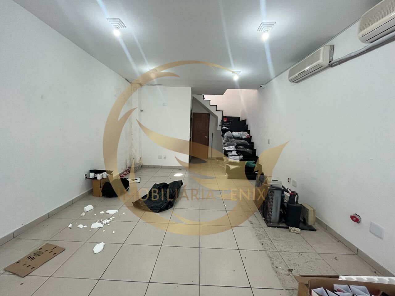 Aproximadamente 40 m² de área de salão, piso frio e pé direito de 3 metros. Mezanino, banheiro e área externa. Porta automática.